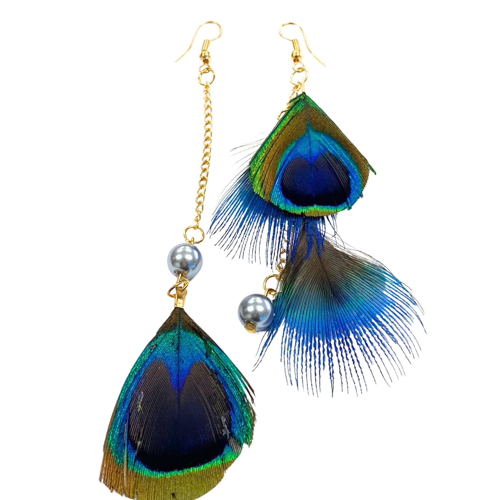 Elevate your style with these stunning asymmetrical earrings, featuring shimmering blue peacock feathers, striking peacock eyes, and delicate gold chain accents. Pearl beads add a touch of elegance, making these lightweight drop earrings a perfect blend of natural beauty and modern sophistication.