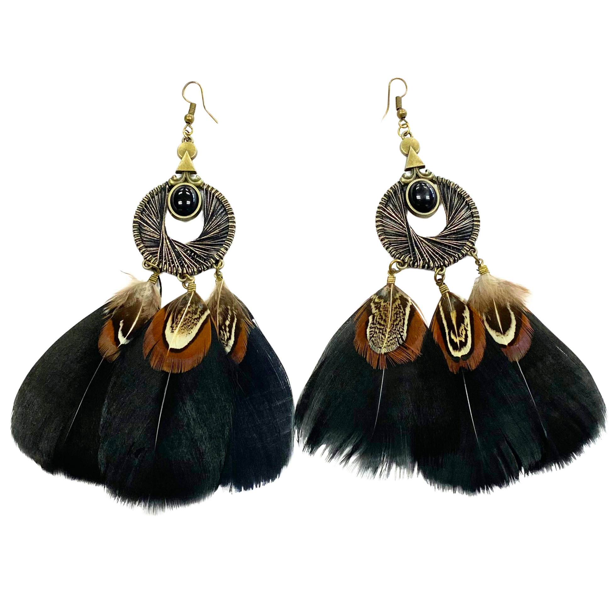 "Introducing our 'Stunning Goose Feather Chandelier Earrings' — a mesmerizing blend of elegance and bold style. These statement earrings feature lush, natural goose and pheasant feathers that cascade in a chandelier design, showcasing bold black feathers with a brown pheasant accent. Lightweight yet eye-catching, they bring a sense of grace and exotic beauty to any outfit, perfect for those who love making a grand entrance. Elevate your look with the unique charm and undeniable elegance of these handcrafted earrings!"